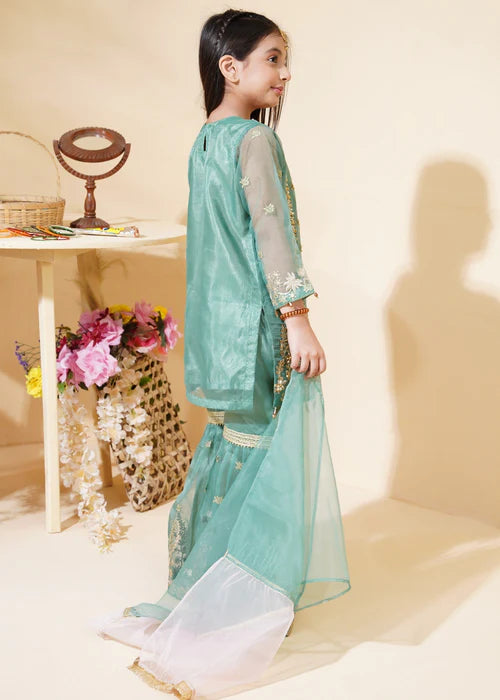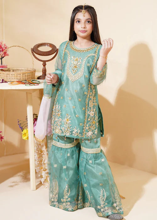 Additional Description: This turquoise organza outfit is the epitome of elegance, designed for your little one to shine at festive events. The delicately embellished shirt, featuring intricate golden details, exudes timeless charm. Paired with traditional gharara pants adorned with heavy embroidery, the ensemble is a perfect blend of sophistication and tradition. The two-tone dupatta adds a vibrant and playful touch, completing the look with grace. Lightweight and comfortable, it allows for effortless movement while ensuring a stylish appearance. Ideal for weddings, Eid, and special gatherings, this outfit is a must-have for creating unforgettable memories.