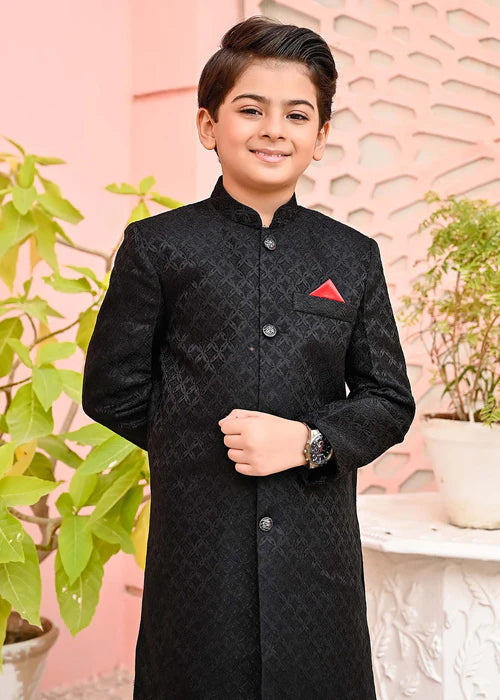 Additional Description: This black sherwani is made from luxurious black Jamawar fabric, which has a rich and intricate pattern. The design is adorned with elegance showcasing traditional motifs and intricate details. Paired with the right accessories, this black Jamawar sherwani is sure to make a lasting impression.