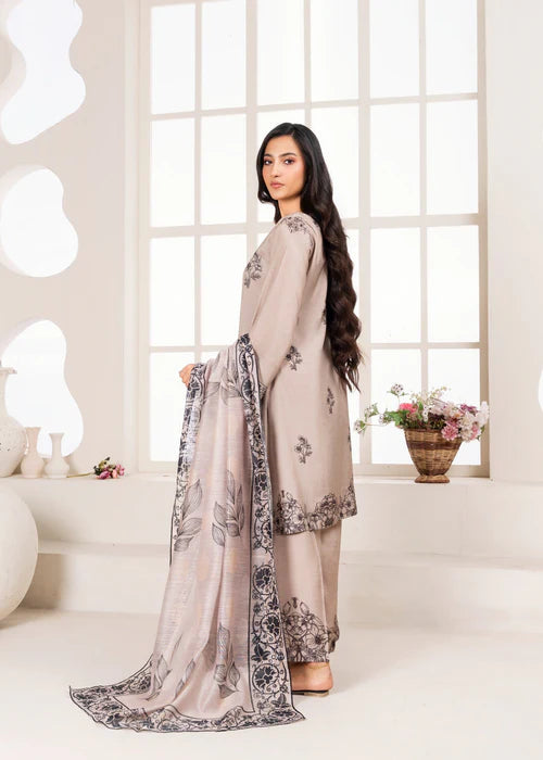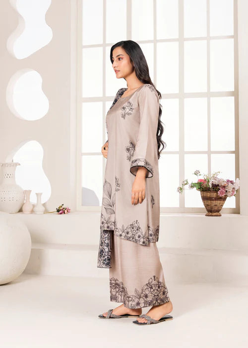 Additional Description: This 3-piece printed karandi silk outfit includes a shirt, trouser, and dupatta in desert beige. The beautiful beige base is adorned with intricate, earthy-toned prints that exude elegance and majesty. The printed duppata and trouser complete the ensemble. This silk karandi fabric blend is breathable and suitable for all seasons/weather conditions.