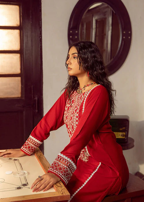 Additional Description: Description Color: Red Fabric Shirt Fabric: Embroidered Silk Karandi Trouser Fabric: Silk Karandi Other Details Weight: 274g Model is wearing size "S"